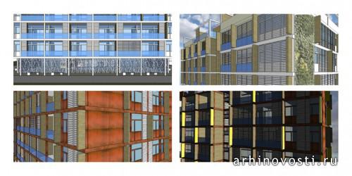 В целях экономии денежных средств, а так же создания единого дизайна, все здания похожи друг на друга. Различие лишь в материалах, используемых для украшения фасада: сталь, цинк, вертикальные прямоугольники из зелени.