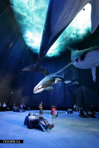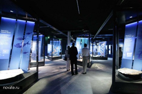 Эта экспозиция, сопровождаемая световыми и звуковыми эффектами, создает очень реалистичное погружение зрителей в бесконечные глубины подводного мира. А в фойе, вдоль эскалаторов, расположены настоящие скелеты китов.