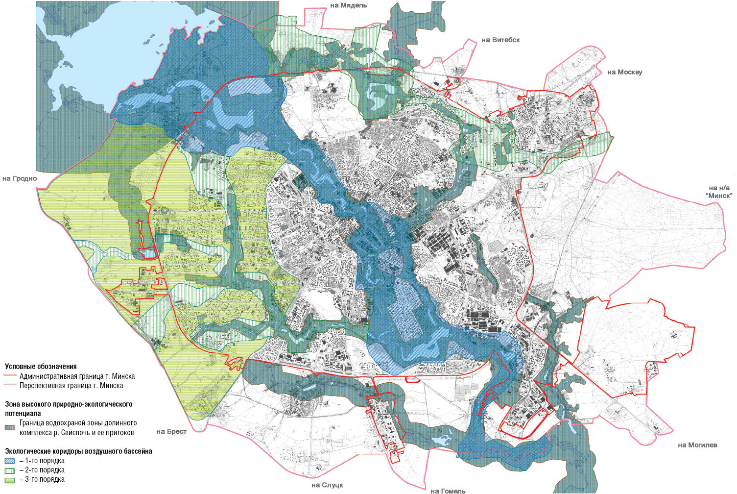 - Создание устойчивой территориальной системы природного комплекса Минска на основе формирования природного каркаса в форме зон с высоким природно-экологическим потенциалом вдоль системы водотоков гидрографической сети в границах водоохранных территорий города, зеленого лесопаркового пояса в окружении периферийной планировочной зоны города и “экологических коридоров” санации воздушного бассейна (п. 1.1).