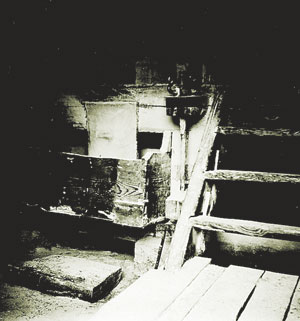 Для мельниц характерно практически полное отсутствие декоративного убранства. Эстетику всего, что связано с ветряками, определял именно динамичный характер производственного процесса, основанного на непосредственном контакте с силами природы, а это особо приукрашивать не было нужды. Силуэты ветряных мельниц очаровывают своими пропорциями и гармоничным единством со средой. Но все же можно отметить, что в интерьере встречаются резные колонки второго яруса — д. Березовка Кормянского р-на, затейливо выкованные винты, регулирующие подъем жерновов, — д. Синичино Буда-Кошелевского р-на (рис. 18).