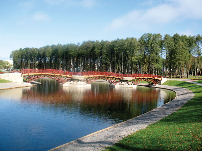 Через водную гладь реки перекинут пешеходный мост, состоящий из трех металлических пролетных строений, подобных тем, что применены в мостиках при пересечении пешеходной аллеи с лыжероллерной трассой. В результате получилось красивое, лаконичное инженерное сооружение, которое привлекает посетителей парка, располагает к отдыху, созерцанию водной глади реки, окружающего ландшафта, исторического центра города и Лидского замка. Отсюда открывается великолепный вид на парковый ансамбль и его композиционный центр – Курган Бессмертия.