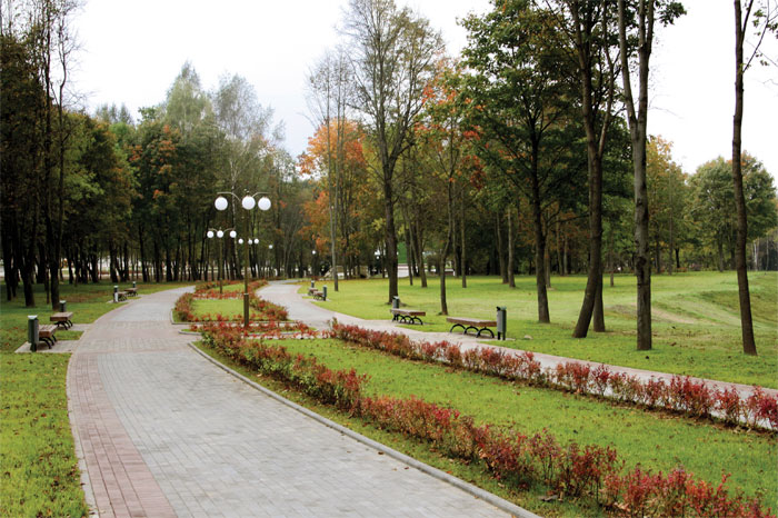 Согласно проекту, произведена установка тротуарных бетонных бордюров, заложены новые объемы мелкоштучных бетонных плиток (разных по конфигурации и цвету) на тротуарах и площадках, организованы места общего пользования для посетителей парка, построен общественный туалет. Благоустройство увязано с прилегающими территориями – тротуары и дорожки расположены с учетом сложившихся пешеходных связей. Освещение организовано светильниками нескольких типов. Дизайн элементов благоустройства и малые архитектурные формы (урны, светильники, остановочные пункты и т.п.) решены в едином стиле. У главных входов размещены вместительные стоянки для транспорта. Все эти решения обеспечили качественный уровень благоустройства городской среды современной Лиды.