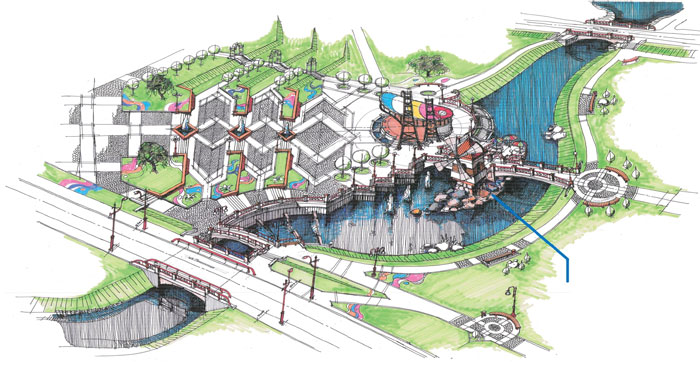 Явно прочитывался вариант размещения главного сценического действа праздника на обширной площадке у Дома культуры в пойме реки Лидейки с возможностью пробивки композиционной, объединяющей планировочной оси через предполагаемую водно-парковую зону с закономерным выходом к спортивно-зрелищным объектам. Для этого нужно было, к радости жильцов, снести всего около десятка обветшалых жилых строений с хозпостройками и произвести мелиоративные работы. Но самое главное – какие возможности давало и в итоге дало это простое планировочное решение по раскрытию видовых точек на распластавшуюся панораму города с его старыми и новыми архитектурными доминантами!
