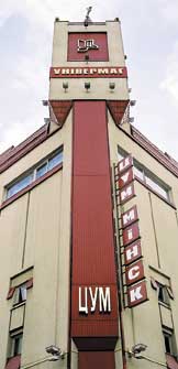 Примером тектоничного включения рекламы в архитектурно-пространственную композицию служит башня на здании ЦУМа в Минске (фото 2). Она выполняет не только градостроительную, пространственно-композиционную, утилитарную функцию, но и рекламную. Согласно тектоничному подходу, архитектор продумал и выделил место для будущей рекламы, а дизайнер-рекламист соответствующим образом разработал рекламную вывеску и литеры. Другое тектоничное архитектурно-рекламное решение в Минске продемонстрировано на примере корпуса предприятия “Белрыба”. Здесь, в отличие от ЦУМа, реклама первична — в основе архитектурно-пространственного решения лежат элементы фирменной символики (знак и цвет). Этот пример показывает, как архитектура может выполнять функцию рекламы или служить ей. Если, допустим, стоит задача спроектировать торговый павильон фирмы, товарным знаком которой является зеленый треугольник, то центром композиции, с одной стороны, и фокусом внимания покупателей, с другой, может стать зеленый треугольный фронтон с расположенным под ним входом и витринами (фото 3).