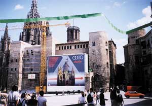 Другое атектоничное решение “не в ущерб” архитектуре продемонстрировано в рекламе автомобиля “Audi”, расположенной на фоне реставрируемого собора в Барселоне. В художественном оформлении большого стенда использовано изображение собора после реставрации. Вданном случае реклама выполняет не только коммерческую функцию. Она украшает строительную площадку и информирует туристов о том, как будет выглядеть собор (фото 7).