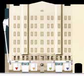Первый подход основан на тектоничном архитектурном решении и согласованном с ним рекламном (фото 1). По этому пути шли конструктивисты 1920-х годов. Они включали надписи в архитектурную композицию исходя из ее тектоники и структуры. Графика не противоречила, а обогащала рисунок наружных плоскостей. Благодаря рекламе достигался дополнительный композиционный эффект. Расположение литер вдоль карнизного пояса и выступающего по периметру высотного объема подчеркивало силуэтную линию здания, а также ее доминирующее значение в архитектурной композиции.