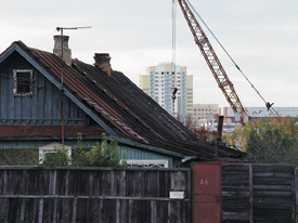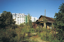 Город‚ словно равнодушный‚ но добросовестный лесоруб‚ прошелся по кровлям, оставив после себя одни пни. Более того‚ и им подрезал корни‚ лишив погребов‚ кладовых. Оттого не прочно стоят они на Земле‚ суетятся-уплотняются. Оттого и не чувствуют Неба‚ царапая его иглами антенн. Лишь там‚ где остался “деревенский” масштаб‚ Город еще может в щелочку полюбоваться восходом-закатом (фото 5).