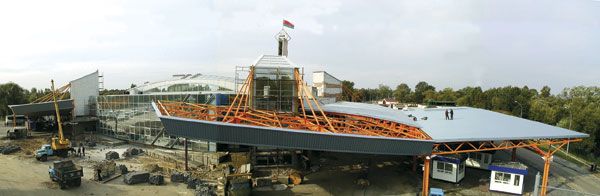 Существующие по линии пристроек витражи наружного ограждения старого здания демонтированы, равно как и часть плит покрытия в центре здания. Сделано это с целью устройства фонарей верхнего света над досмотровыми залами (атриумом).