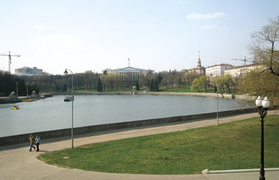 По поводу организации выигрышного окружения репрезентативных объектов. В Минске для обеспечения воздушной оболочки, для создания аванпространств сложилась уникально благоприятная ситуация. Водно-зеленый диаметр и полукольца позволяют дать воздух многим объектам — см. проспект Победителей (б. Машерова) до “Атланта”, а также выборочные снимки на рис. 4, 5, где показаны аванпространства, позволяющие выгодно представить здания. И вместе с тем “воздух” вокруг объекта весьма уязвим. В процессе преобразований он может утратить свою демонстрирующую роль.